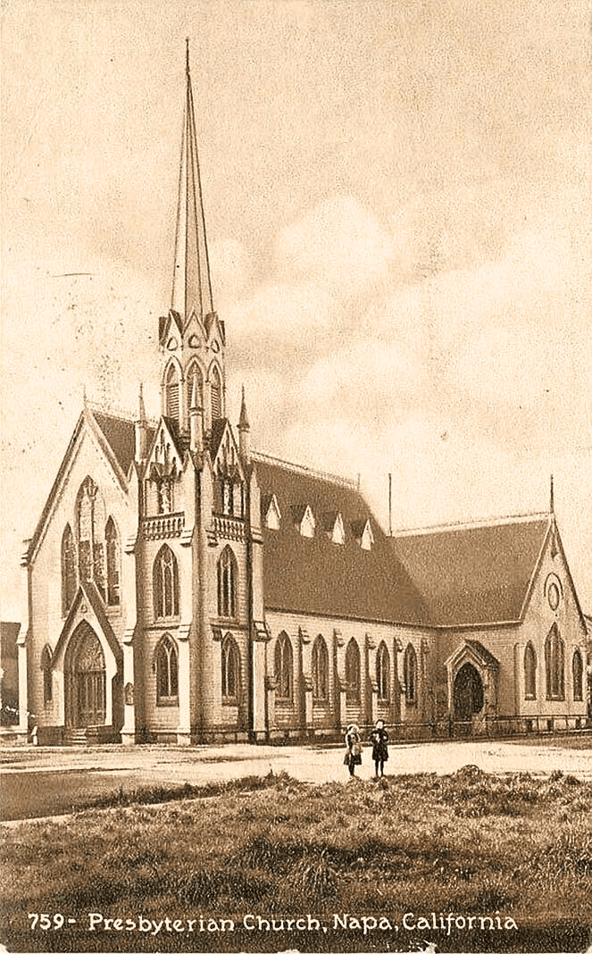 First Presbyterian Church dates back to 1853. A small group of worshipers, who met weekly in the Napa County Courthouse, organized a "Society." By 1857, the Society had completed a comfortable house of worship on a 60 x 120 foot lot on Randolph Street; the lot was donated to the Society by Nathan Coombs.
